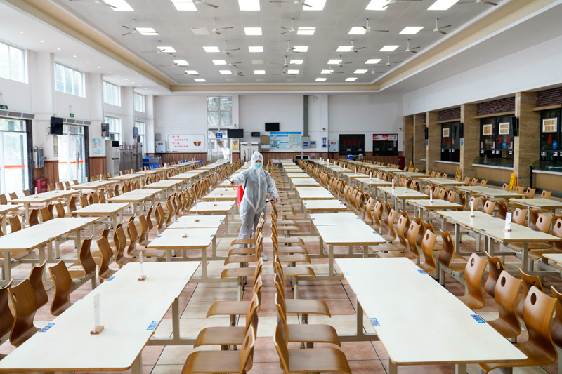 2月1日,在西南大學楠園學生二食堂,工作人員在對食堂進行消殺作業。