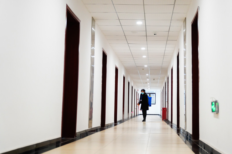 2月1日,在西南大學一學生宿舍,宿管人員在走廊進行消殺作業。