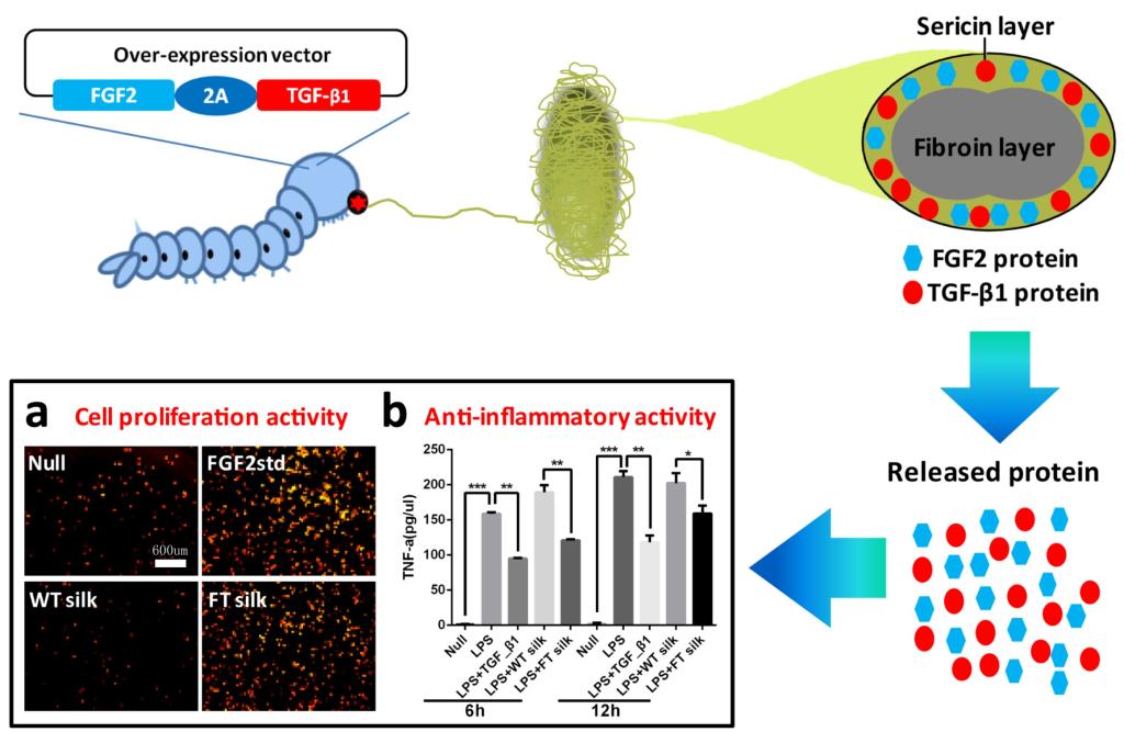 蠶絲是一種性能優異的蛋白纖維,被廣泛應用于紡織服裝領域。作為一種天然的高分子蛋白,蠶絲蛋白在材料學領域也有廣泛的應用前景。12月24日,生物材料領域頂級雜志Acta Biomaterialia在線發表學校前沿交叉學科研究院生物學研究中心、重慶市蠶絲纖維新材料工程技術中心研發人員題為“Genetically engineered bi-functional silk material with improved cell proliferation and anti-inflammatory activity for medical application”(遺傳改良具有促細胞增殖與抗炎雙功能的新型蠶絲材料)的研究論文。