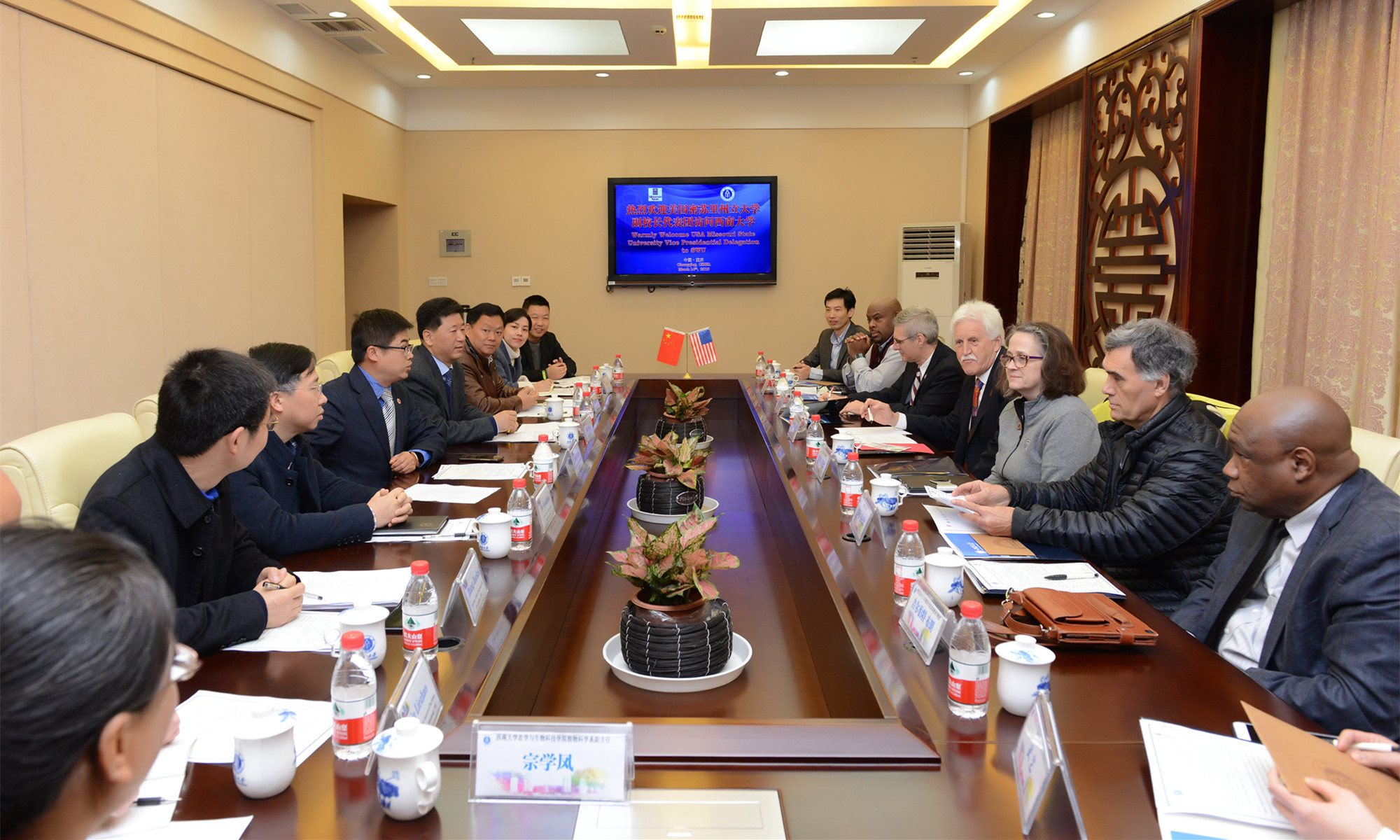 貝克副校長(zhǎng)感謝靳校長(zhǎng)的熱情接待,并詳細(xì)介紹了此行目的,希望通過(guò)接下來(lái)與西南大學(xué)教育學(xué)部、農(nóng)學(xué)與生物科技學(xué)院等單位的交流,探討兩校教育學(xué)領(lǐng)域的博士研究生聯(lián)合培養(yǎng)、農(nóng)學(xué)領(lǐng)域的碩士研究生聯(lián)合培養(yǎng)等合作事宜。