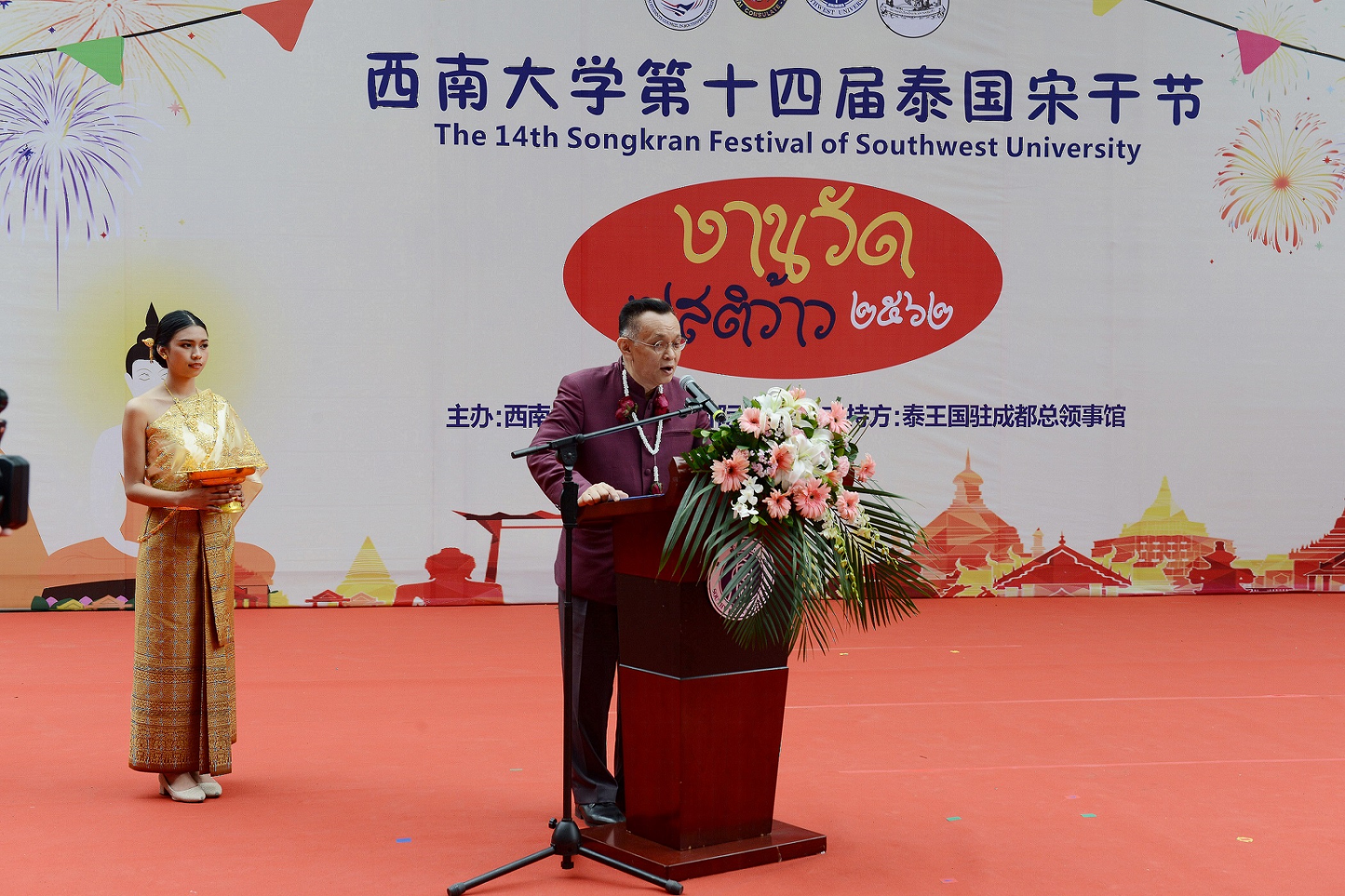 4月10日下午,學校第十四屆泰國宋干節舉行。泰王國駐成都總領事館總領事吳威德、重慶市公安局出入境管理局和北碚公安分局的有關領導、學校副校長靳玉樂,以及學校相關職能部門負責人應邀出席本次活動。中外師生500余人共同歡度泰歷新年。