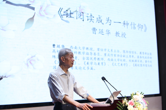 《西南大學賦》的作者、曾任西南師范大學圖書館館長的曹廷華教授進行了“讓閱讀成為一種信仰”的主題分享。