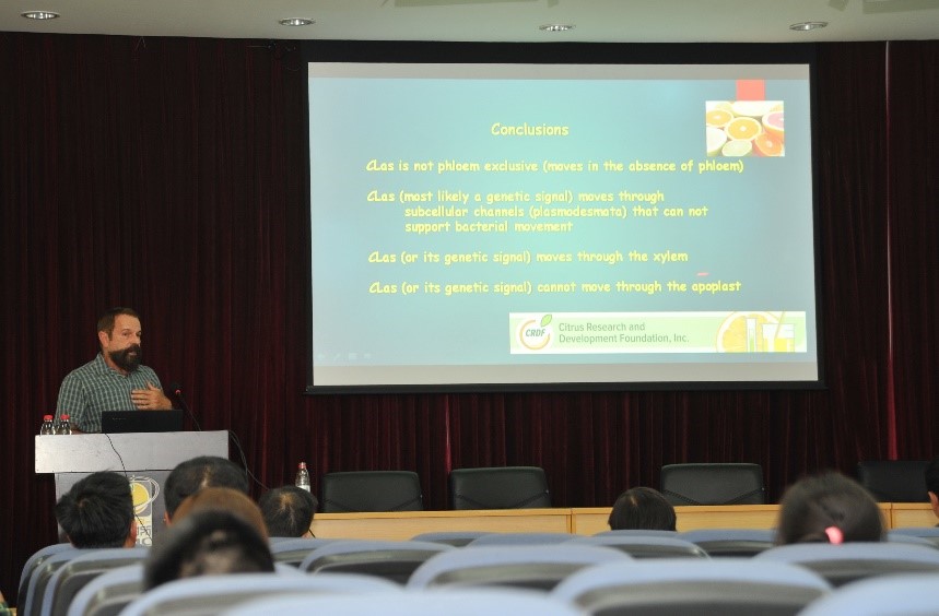 5月7日,應“柑桔主要病蟲害持續控制基礎研究學科創新引智基地”(111計劃)和柑桔研究所邀請,美國佛羅里達大學柑橘研究與教育中心Edgardo Juan Etxeberria教授來所訪問,做了題為“HLB,More Questions Than Answer”的學術報告,報告會由柑橘研究所鄭永強教授主持。