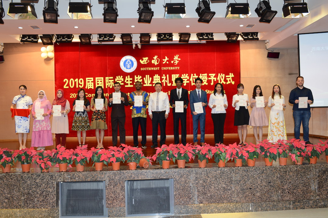 6月24日上午,學校舉行2019屆國際學生畢業典禮暨學位授予儀式。校長張衛國,副校長王進軍,相關職能部門和學院負責人出席典禮。各學院教師代表、國際學生代表、2019屆畢業生及其親友參加典禮。典禮由國際學院黨總支書記劉猛主持。