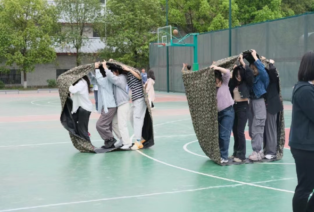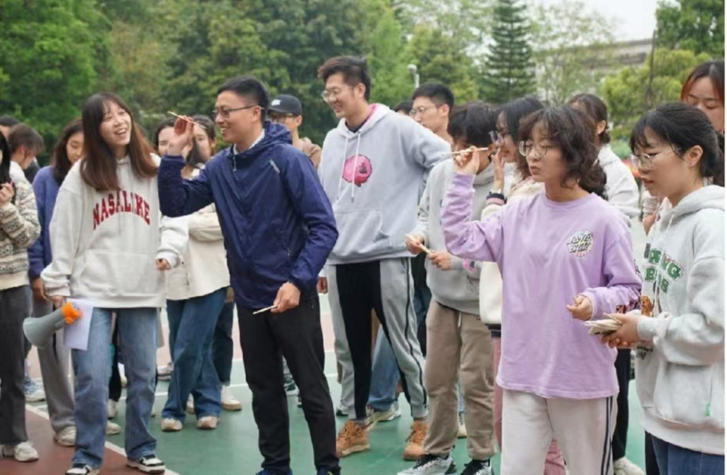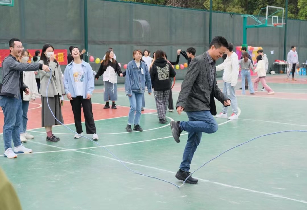 本屆導師團隊賽設“雅歌投壺”(投竹簽)、“八仙過海”(顛球前進)、“比詞傳信”(你比我猜)、“痛快悅動”(指壓板長繩)“一圈到底”(傳遞呼啦圈)、“無敵風火輪”(滾布袋前進)及“紙杯接力”七個趣味項目。在“一圈到底”比賽中,老師和同學們手拉手用身體傳遞呼啦圈到終點并返回,師生們手挽手、心連心,相互配合,共同朝著目標奔去;“八仙過海”項目中,師生們隨著哨響,牢牢把握節奏,腿下生風,手上平穩,波瀾不驚,動作迅速;“無敵風火輪”比賽中老師與同學們共同商量策略,做好分工,充分展現自己在團隊中的優勢,努力賽出更好的成績,“雅歌投壺”現場,每位導師說出一句詩詞,命中籃筐,都會引起場下同學們的陣陣歡呼……比賽過程中每個項目參賽隊員都精神抖擻,全面展現了頑強拼搏的精神和團隊協作的能力,圍觀同學傳來陣陣歡呼吶喊,現場氣氛激烈又活躍。賽場上運動模糊了師生界限,導師與他們的學生齊心協力,用昂揚活力為全場帶來精彩的比賽,展現了團結奮斗的體育精神和良好的精神風貌。