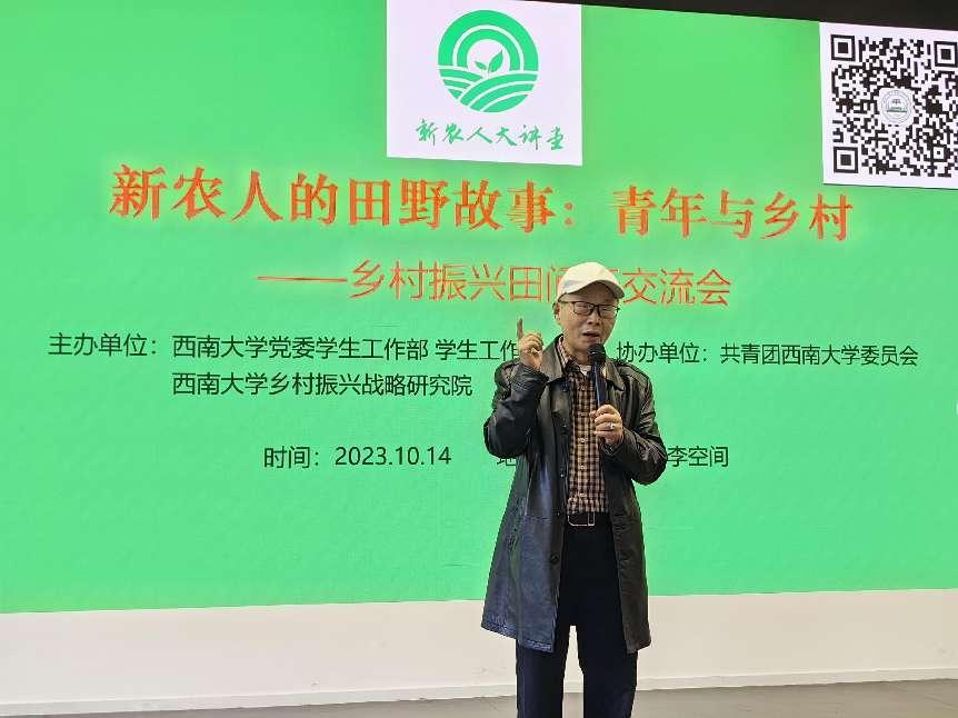 10月14日下午,由黨委學生工作部 學生工作處、鄉村振興戰略研究院主辦,團委協辦的“新農人的田野故事—鄉村振興田間行”交流會在青李空間舉行。來自“鄉村振興田間行”2023實習生和暑期志愿者,學校涉農學院100余名同學參加交流學習。晏陽初先生侄孫、西南大學中國鄉村建設學院名譽院長晏鴻國老先生特邀出席活動。相關部門領導、老師,農學與生物科技學院、教育學部教師代表,大理新生活實踐者、四十英尺民宿主理人王丹,中國電影家協會會員、中國電視藝術家協會成員韓君倩導演,巴渝農耕文化陳列館館長劉剛受邀出席活動。鄉村振興戰略研究院培訓中心主任張斌主持交流會。