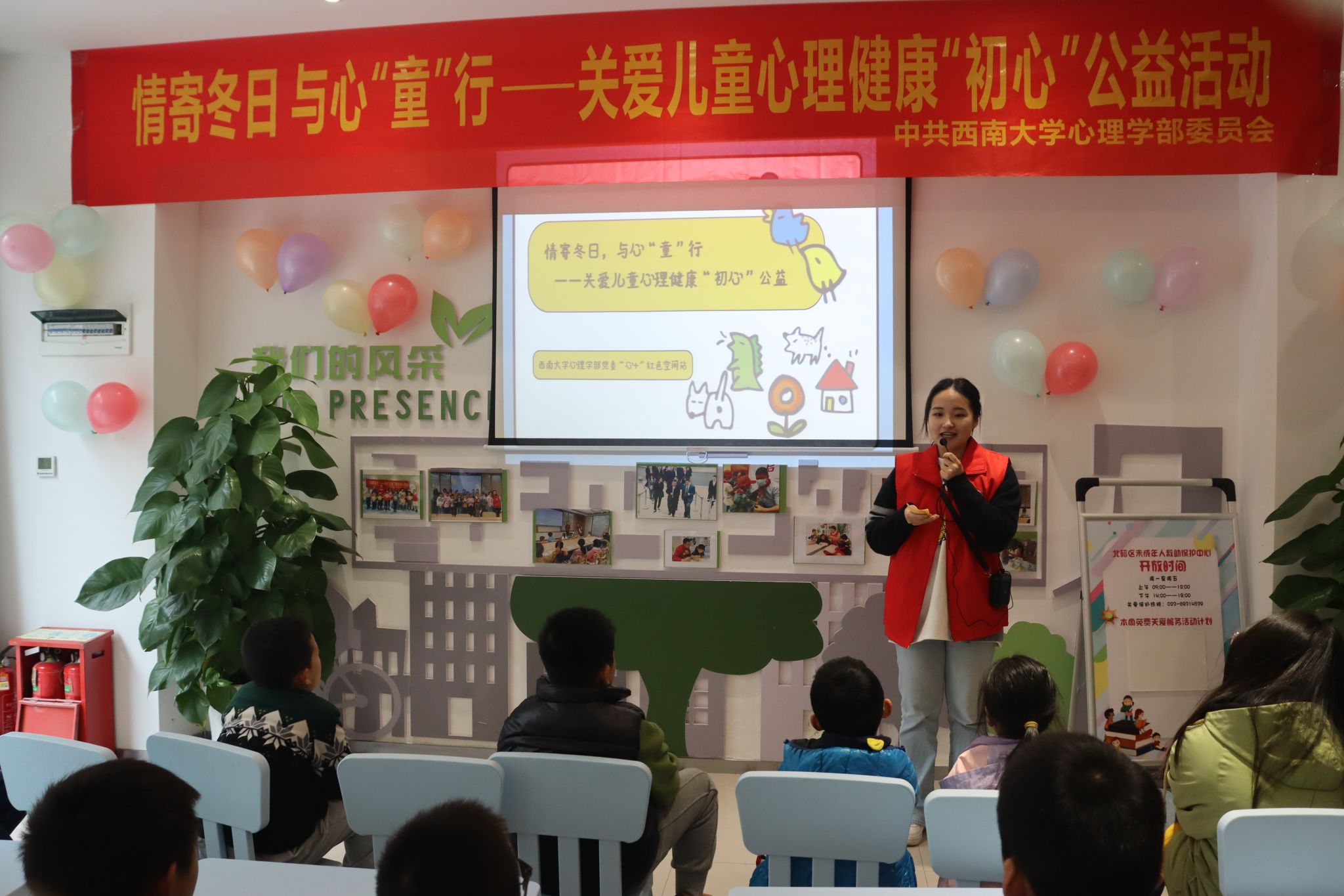 為呵護兒童心理健康,助力健康中國建設,2023年12月2日下午,心理學部黨委組織學生赴北碚區未成年人救助保護中心,開展“情寄冬日,與心‘童’行”關愛兒童心理健康“初心”公益活動。學部黨委組織員熊丹帶領“心+”紅色空間站成員、入黨積極分子培訓班學員及各支部黨員代表,為近20名兒童提供心理健康志愿服務。