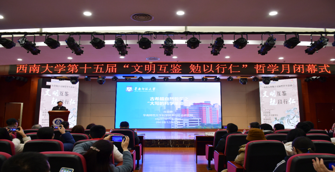 12月22日晚19:00,西南大學第十五屆“文明互鑒·勉以行仁”哲學月閉幕式在校博物館4樓報告廳隆重舉行。華南師范大學特聘教授肖顯靜、校社科處副處長王作軍、學生處助學中心主任孫金春、博物館副館長譚志敏、國家治理學院副院長郭美云、張永紅、何健以及全校師生200余人參加了閉幕式。