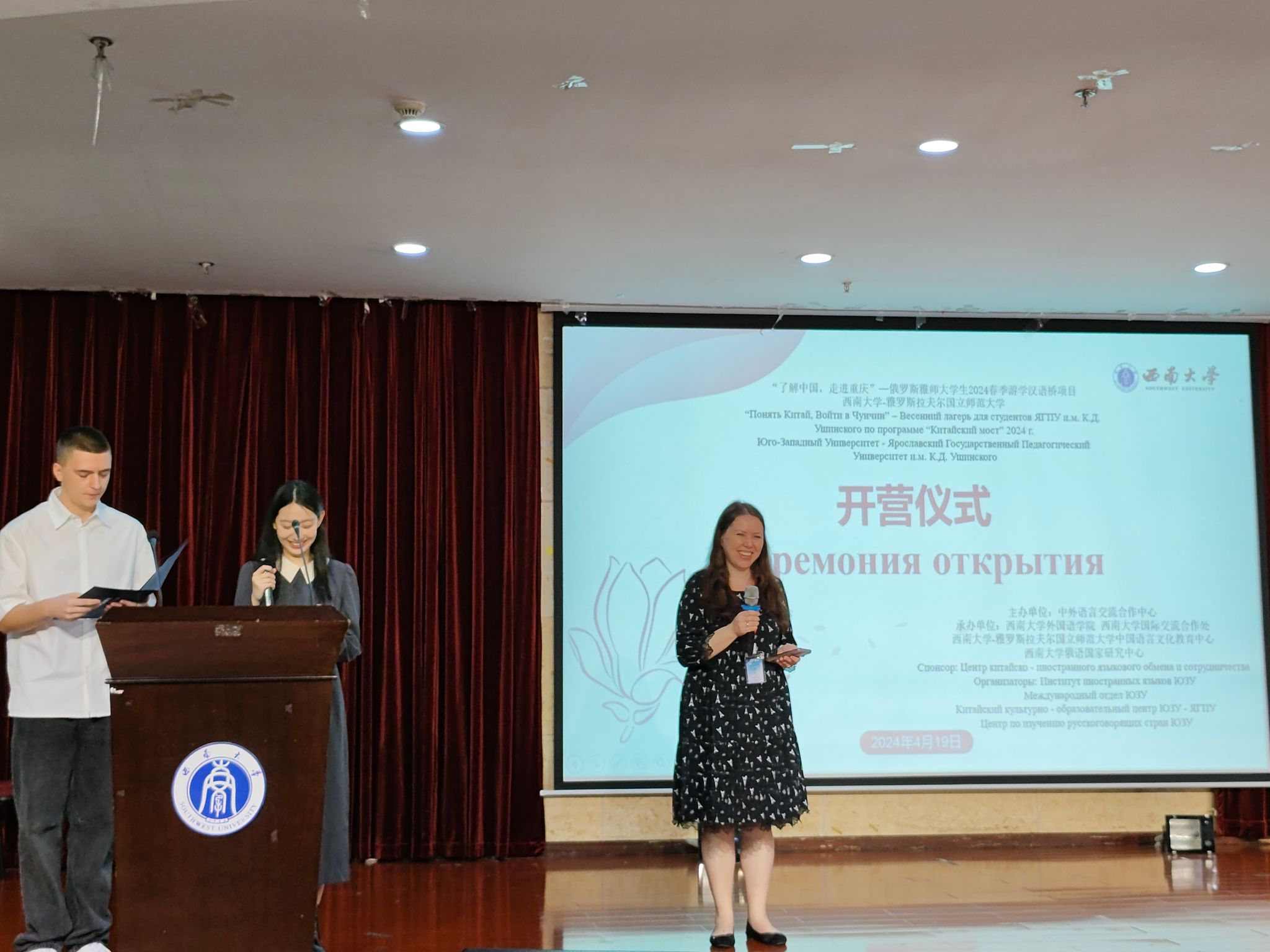 4月19日上午9時,由教育部中外語言交流合作中心主辦,俄羅斯雅羅斯拉夫爾國立師范大學(以下簡稱“雅師大”)大學生參加的“了解中國、走進重慶”2024年“漢語橋”項目外國學生春令營活動在西南大學外國語學院101報告廳拉開序幕。西南大學國際合作與交流處代遠鴻副處長,外國語學院黨委書記徐天虹、副書記紀委書記李曉暢、俄語系主任謝周教授、俄語系外教葉蓮娜·鮑爾德列娃教授、奧爾加·卡茲敏娜副教授以及俄方帶隊老師卓雅·克拉特諾娃、全體營員等出席了本次開營儀式。
