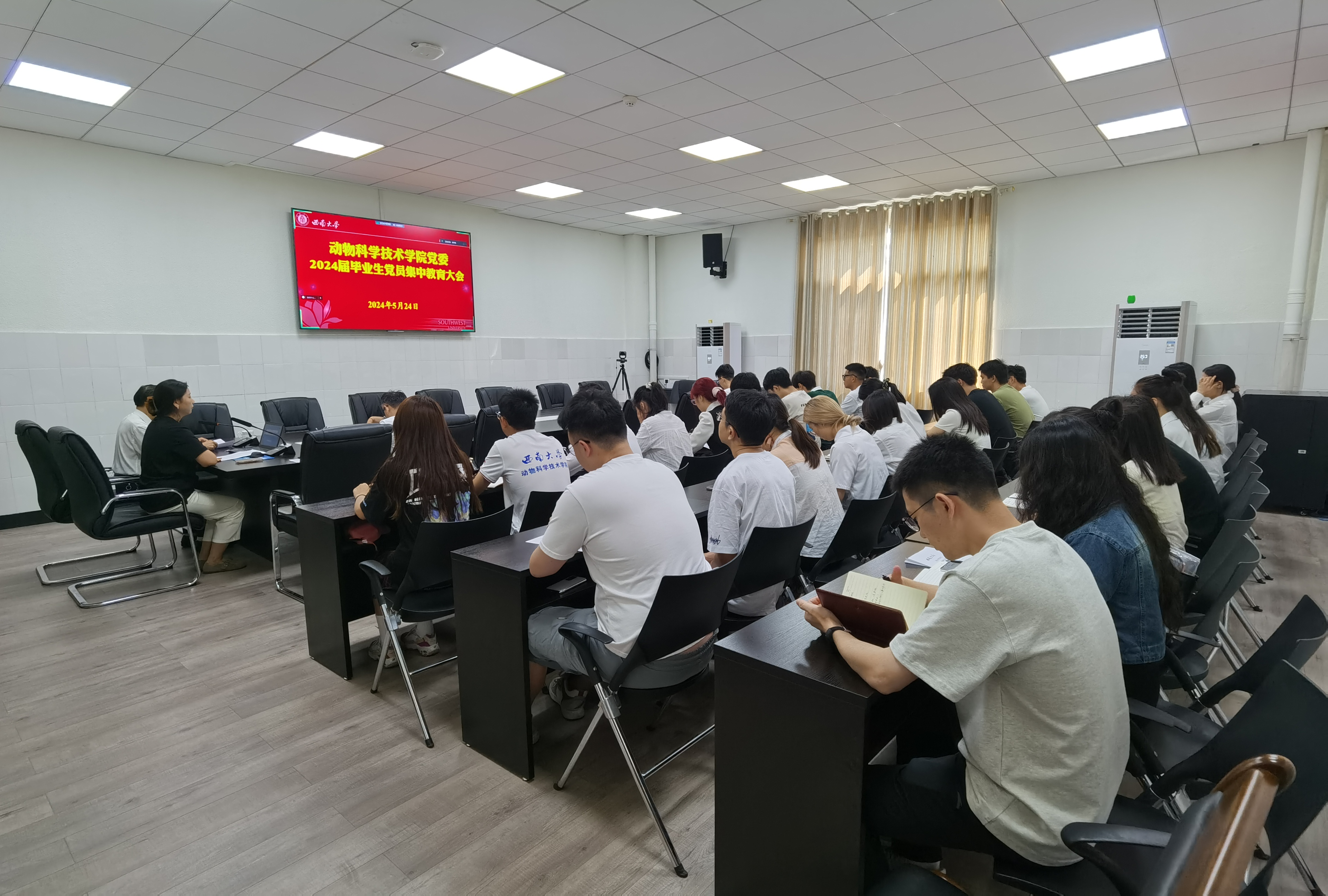 為一步強化畢業生黨員教育,激勵畢業生黨員堅定理想信念,牢記黨員身份,動物科學技術學院黨委于5月24日上午分榮昌、北碚兩個會場同步視頻召開2024屆畢業生黨員集中教育大會。學院黨委副書記、紀委書記文武,全體學生黨支部書記及2024屆畢業生黨員參加了會議。會議由畢業生輔導員彭香主持。