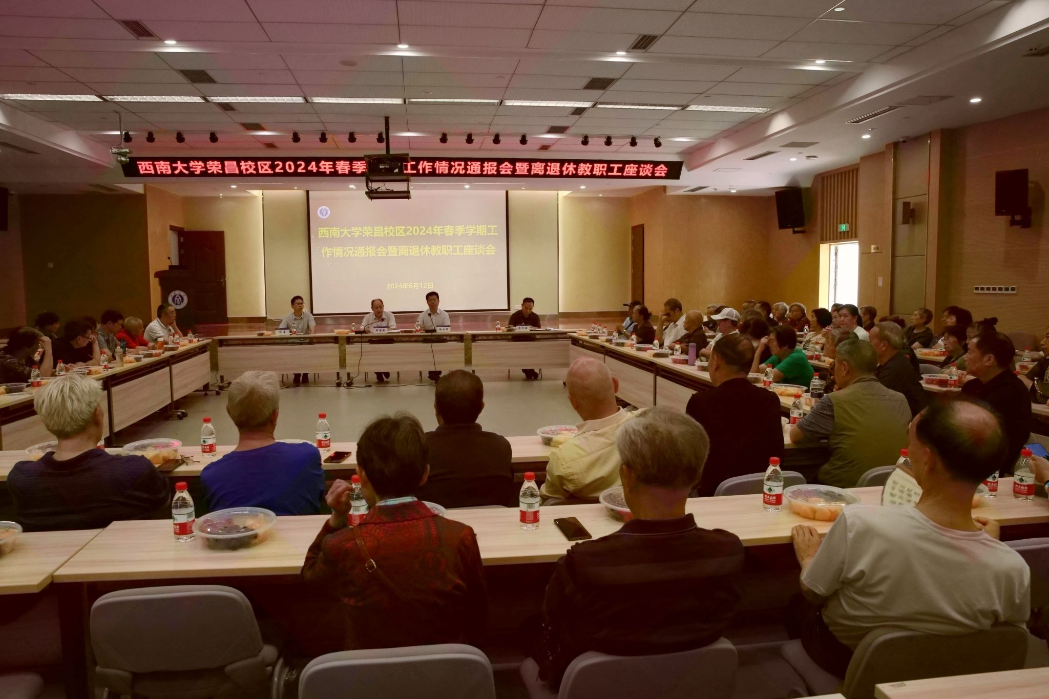 6月12日,西南大學榮昌校區2024年春季學期工作情況通報會暨離退休教職工座談會在7B101報告廳舉行,校區管委會主任趙永聚主持會議,校區黨工委書記周國安通報工作情況。校區黨工委副書記、紀工委書記穆奎,副處級組織員包爾泉出席會議,離退休工作辦公室全體工作人員及70余名離退休教職工參加會議。